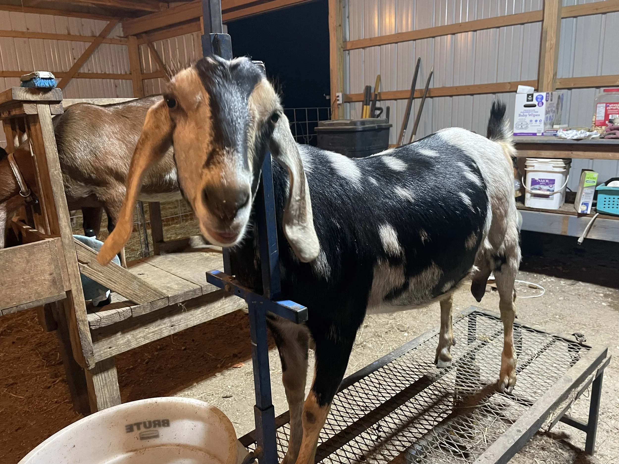 2024: Clover held her kids hostage eight days beyond her due date this year. While we expected her to kid at the end of December in 2023, she didn’t give us her beautiful twin does until January 4, 2024. Both girls presented perfectly and Clover had absolutely zero issues with delivery. The first out, Kansas Bluestem JustALuckyChrm, is brown with fading cream/white spots. She was quickly followed by “Ducky” (Kansas Bluestem JustALuckyDuck), which is black with fading cream/white spots. The twins were within ¼-pound of one another in weight and 100% healthy. If we hadn’t been confident of her due date, we wouldn’t have known they were over a week late. Clover kicked off her third lactation strongly, putting over 10 pounds in the pail on her first test of the year, quickly followed by a 12 pound test just 24 days later. We’re very excited to see this doe go through a full 305 day lactation this season, and expect a fantastic year of production from her.