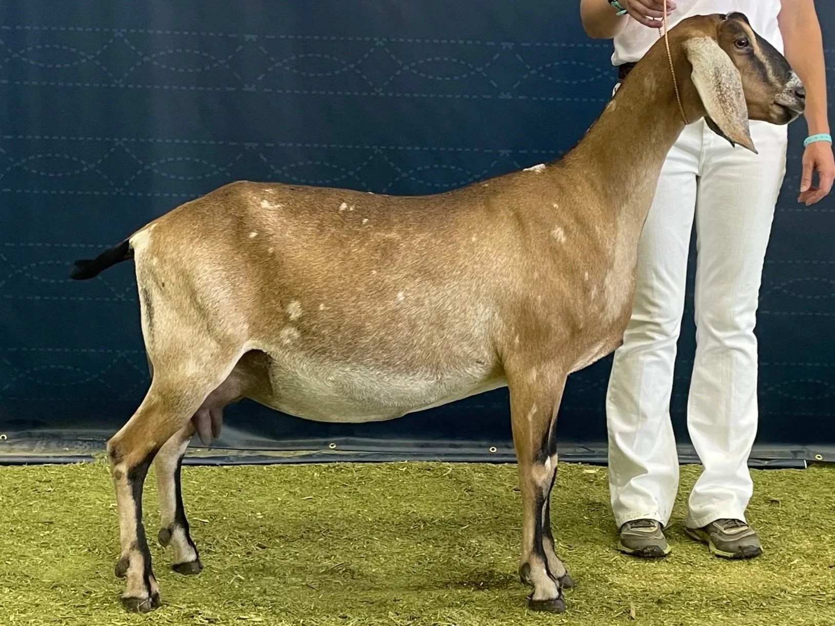 Stella is our only daughter of Goddard Farm Sphinx and a paternal sister to Kansas Bluestem Ethel- both are does we absolutely love! We sold Stella as a dry yearling in October of 2022, with first right to buy back. In April of 2024, as a bred doe, expecting her second freshening any day, brought Stella home again. Stella is the exact picture of what we hoped to get when breeding her dam, Sphinx, with her sire, Zao Hot Fudge.