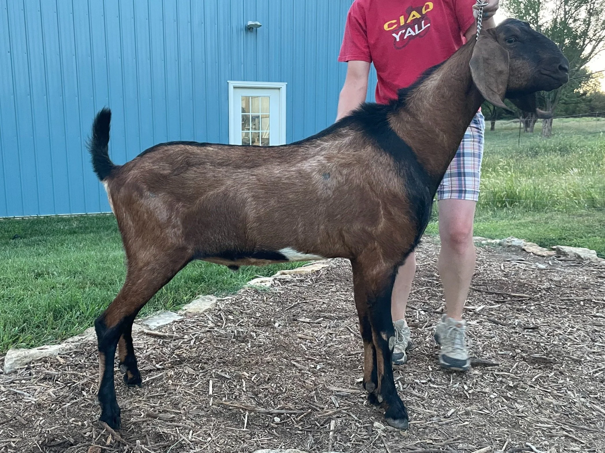 Fudge was the first buck we purchased. He was bred and bottle raised by Jennifer Wilson of Zao Life Farms, Inman, KS. Unfortunately, we fed him some milk from a CAE+ doe we owned when he was a baby, and that made him CAE+ himself. He grew very quickly with great width and front end conformation, but his CAE+ status affected his ability to maintain muscle mass, and caused arthritis in his joints. He was also dangerously agressive during rut, to anyone or anything entering his pen that wasn’t a doe in heat. His personality prevented us from presenting him for appraisal. We put Fudge down in December of 2022, because of his dangerous behavior during rut, and his arthiritis.